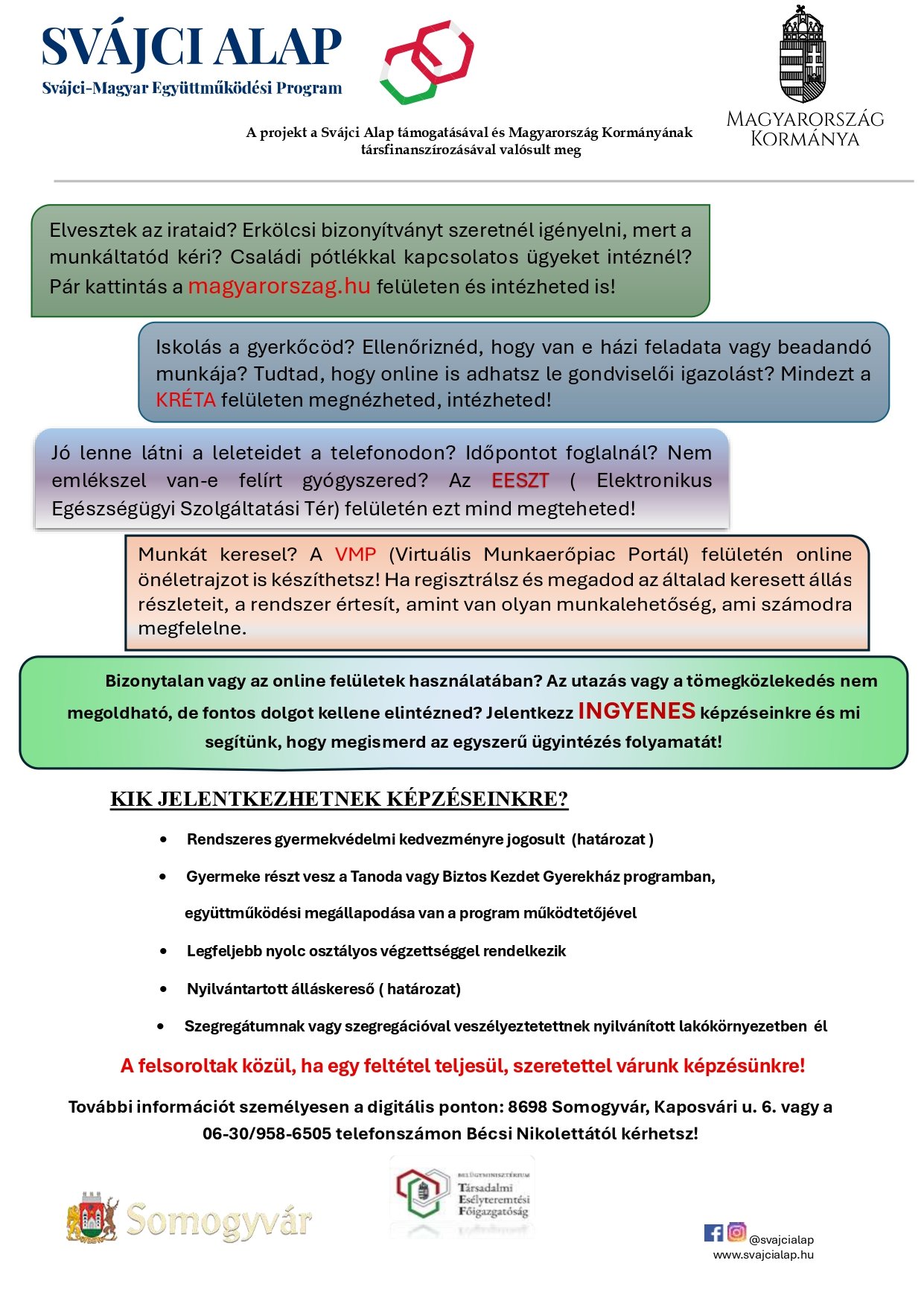 Digitális szolgáltató pont jött létre Somogyváron a Svájci–Magyar Együttműködési Program támogatásával. A digitális szolgáltató pont a Somogyváron és a környező településeken élők számára is elérhető.